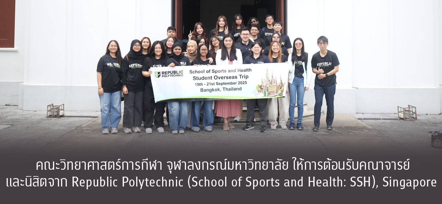 คณะวิทยาศาสตร์การกีฬา จุฬาลงกรณ์มหาวิทยาลัย ให้การต้อนรับคณาจารย์และนิสิตจาก Republic Polytechnic (School of Sports and Health: SSH), Singapore เมื่อวันที่ 19 กันยายน 2568 การศึกษาดูงานในครั้งนี้มีวัตถุประสงค์เพื่อแลกเปลี่ยนเรียนรู้ด้านวิชาการและงานวิจัย โดยมี ผู้ช่วยศาสตราจารย์ ดร.ณัติพร นกแก้ว (รองคณบดี) และ รองศาสตราจารย์ ดร.วรรณพร ทองตะโก (รองคณบดี) ให้การต้อนรับ พร้อมด้วย รองศาสตราจารย์ ดร.ชัยพัฒน์ หล่อศิริรัตน์ (คณบดี) นำเยี่ยมชมคณะฯ ทั้งสองฝ่ายได้ร่วมกันนำเสนอและแลกเปลี่ยนความรู้ด้านวิทยา