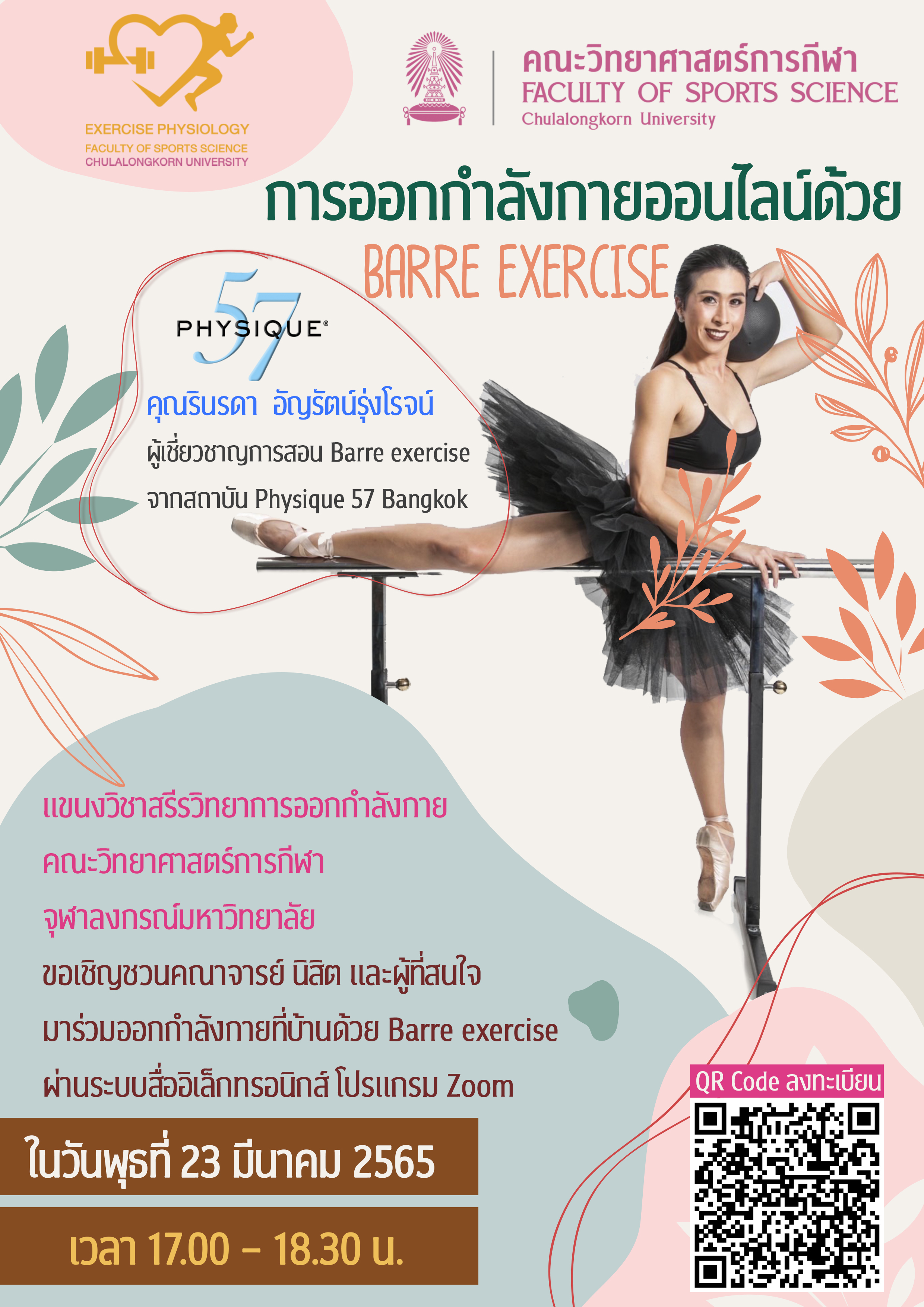 ขอเชิญชวนคณาจารย์ นิสิต และผู้ที่สนใจเข้าร่วม การออกกำลังกายออนไลน์ด้วย Barre exercise