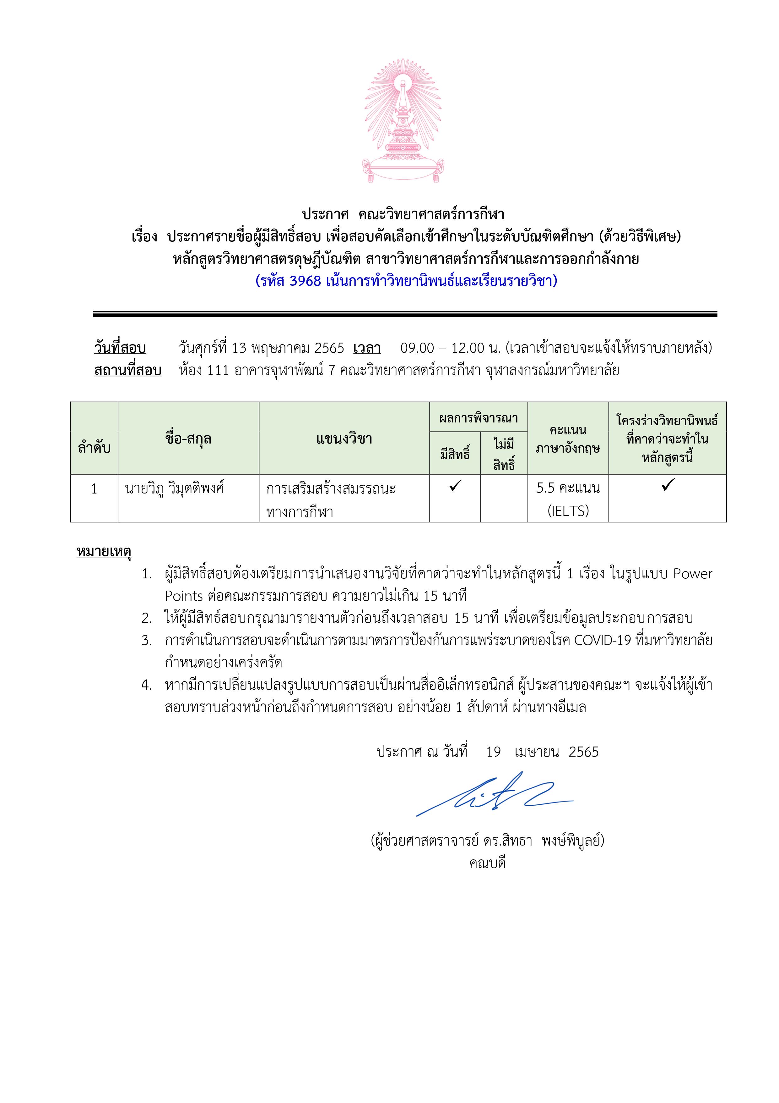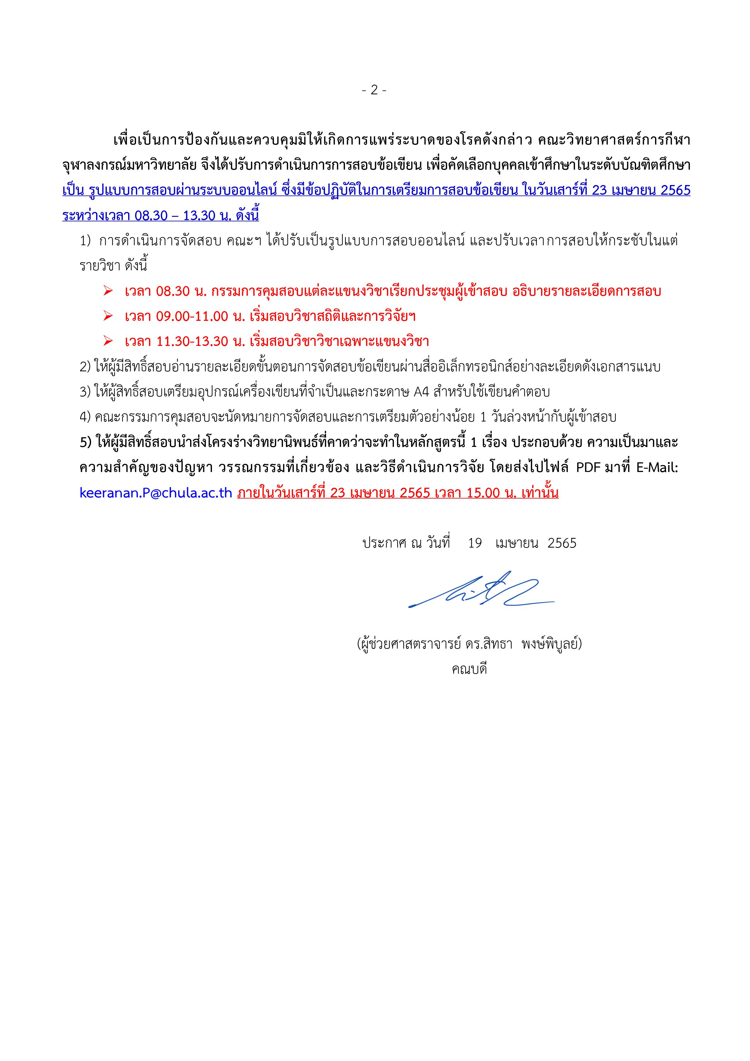 ประกาศรายชื่อผู้มีสิทธิ์สอบข้อเขียน เพื่อสอบคัดเลือกเข้าศึกษาในระดับบัณฑิตศึกษาหลักสูตรวิทยาศาสตรดุษฎีบัณฑิต ประจำภาคการศึกษาต้น ปีการศึกษา 2565