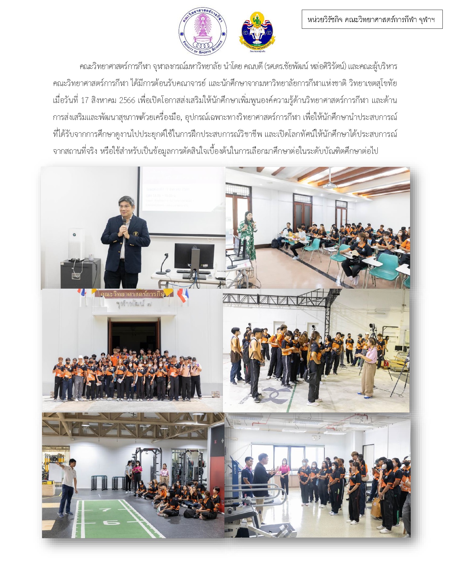 เพื่อเปิดโอกาสส่งเสริมให้นักศึกษาเพิ่มพูนองค์ความรู้ด้านวิทยาศาสตร์การกีฬา และด้านการส่งเสริมและพัฒนาสุขภาพด้วยเครื่องมือ, อุปกรณ์เฉพาะทางวิทยาศาสตร์การกีฬา เพื่อให้นักศึกษานำประสบการณ์ที่ได้รับจากการศึกษาดูงานไปประยุกต์ใช้ในการฝึกประสบการณ์วิชาชีพ และเปิดโลกทัศน์ให้นักศึกษาได้ประสบการณ์จากสถานที่จริง หรือใช้สำหรับเป็นข้อมูลการตัดสินใจเบื้องต้นในการเลือกมาศึกษาต่อในระดับบัณฑิตศึกษาต่อไป