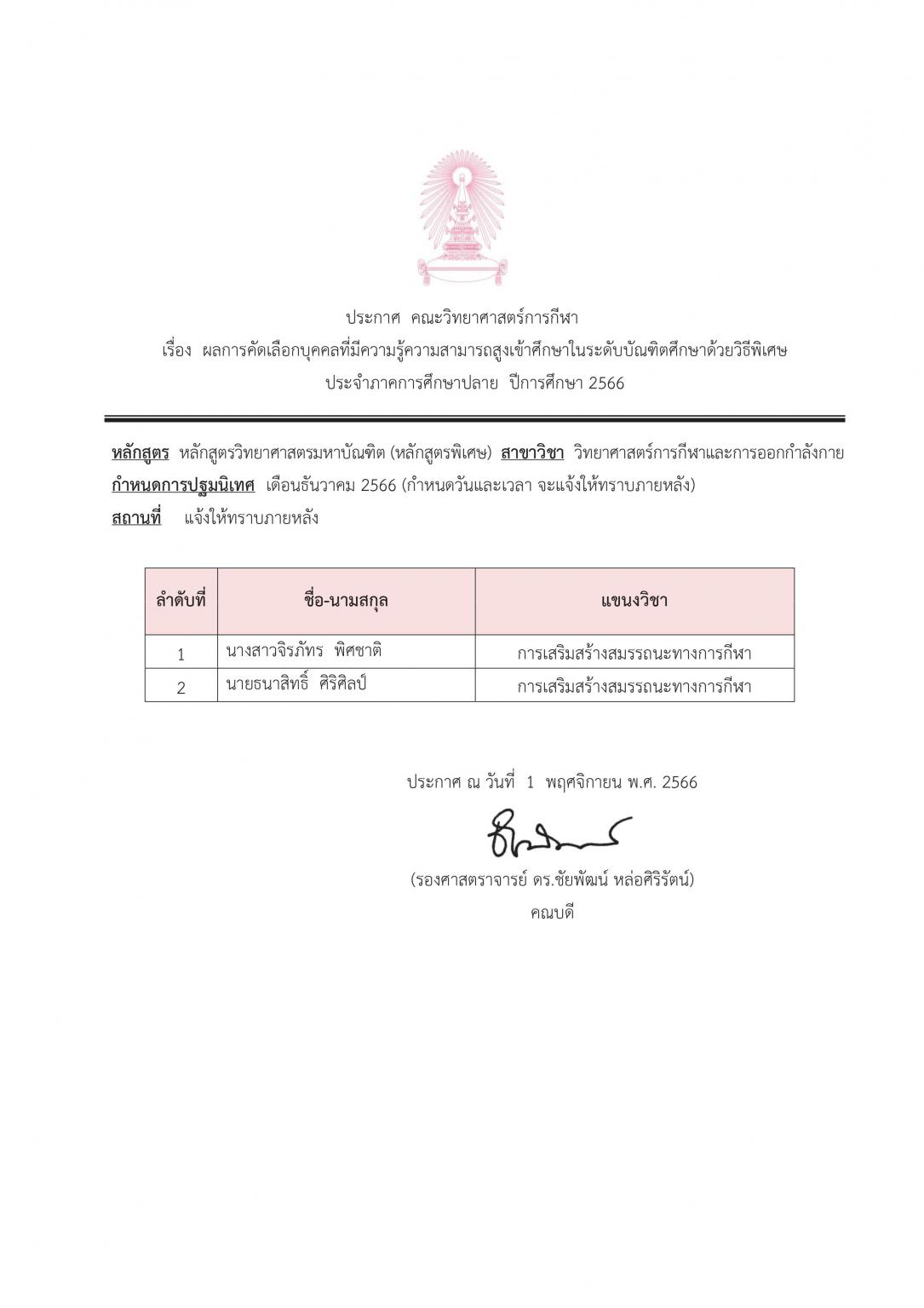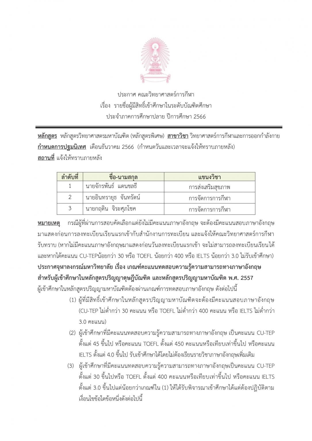 ประกาศ คณะวิทยาศาสตร์การกีฬา เรื่อง รายชื่อผู้มีสิทธิ์เข้าศึกษาในระดับบัณฑิตศึกษา ประจำภาคการศึกษาปลาย ปีการศึกษา 2566 หลักสูตรวิทยาศาสตรมหาบัณฑิต (หลักสูตรพิเศษ) สาขาวิชา วิทยาศาสตร์การกีฬาและการออกกำลังกาย