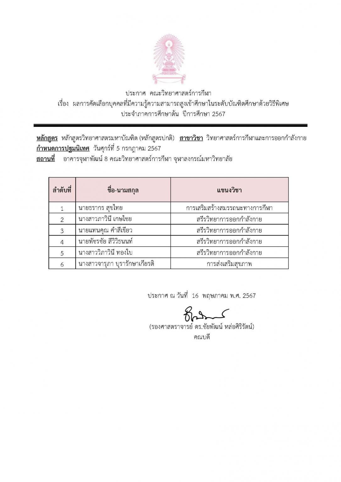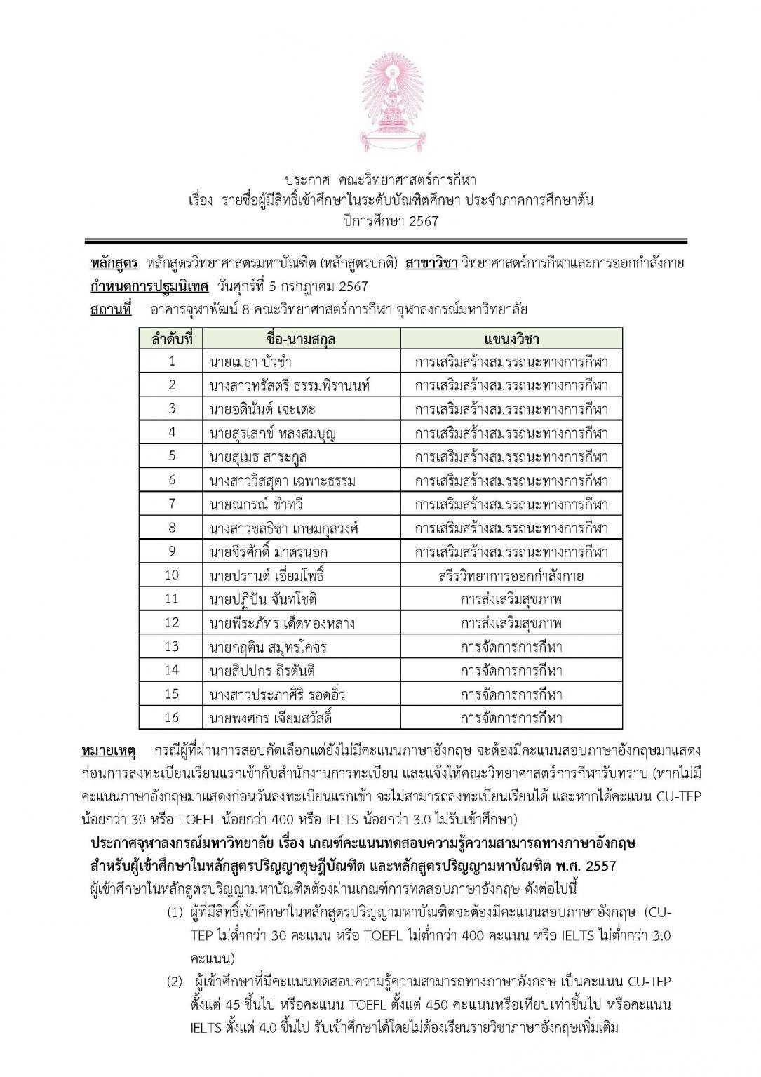 รายชื่อผู้มีสิทธิ์เข้าศึกษาในระดับบัณฑิตศึกษา ประจำภาคการศึกษาต้น ปีการศึกษา 2567 หลักสูตรวิทยาศาสตรมหาบัณฑิต (หลักสูตรปกติ) สาขาวิชา วิทยาศาสตร์การกีฬาและการออกกำลังกาย
