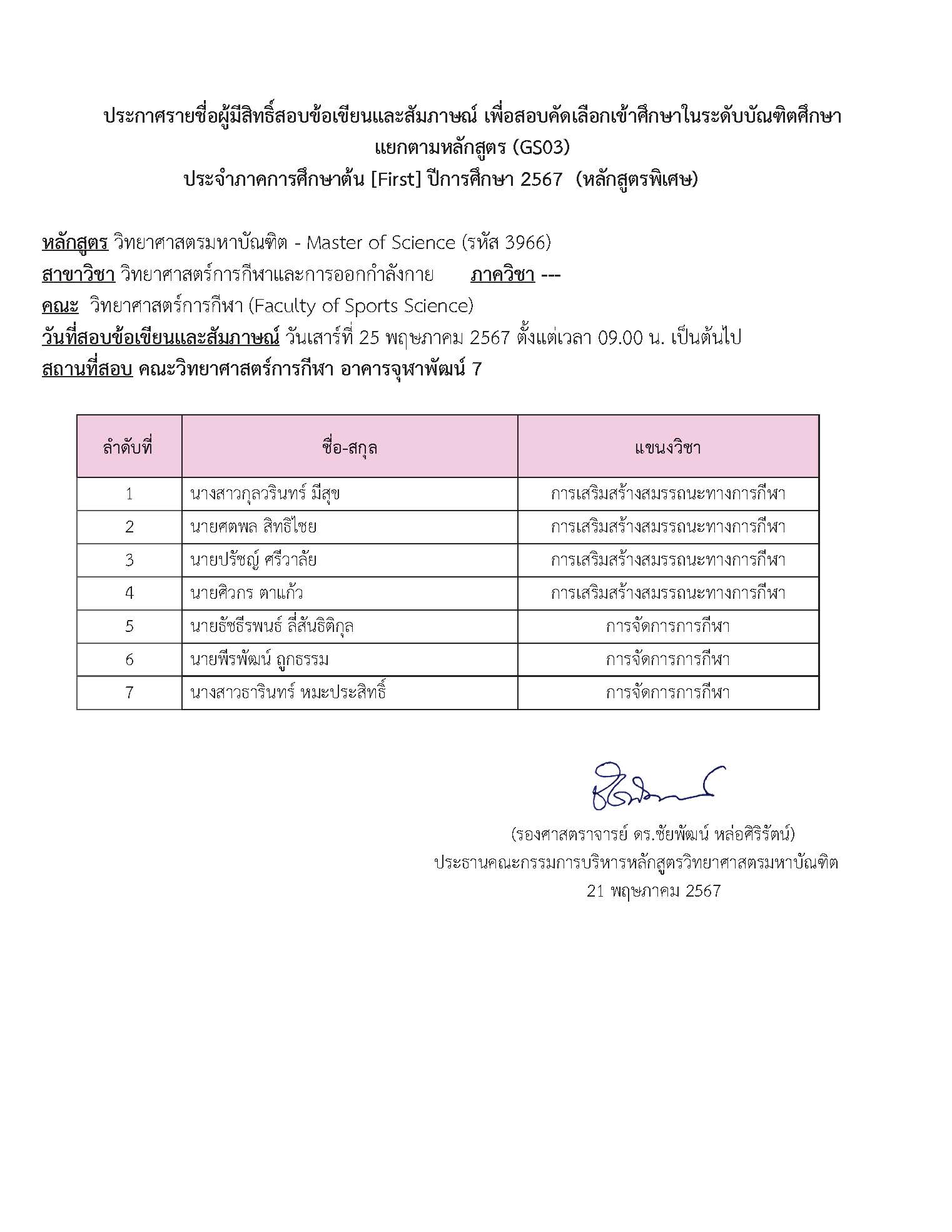 ประกาศรายชื่อผู้มีสิทธิ์สอบข้อเขียนและสัมภาษณ์ เพื่อสอบคัดเลือกเข้าศึกษาในระดับบัณฑิตศึกษา แยกตามหลักสูตร (GS03) ประจำภาคการศึกษาต้น ปีการศึกษา 2567 (หลักสูตรพิเศษ)