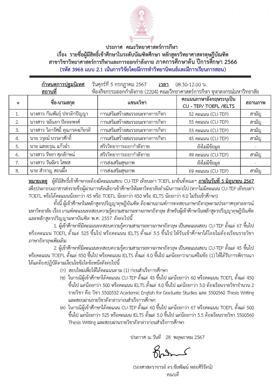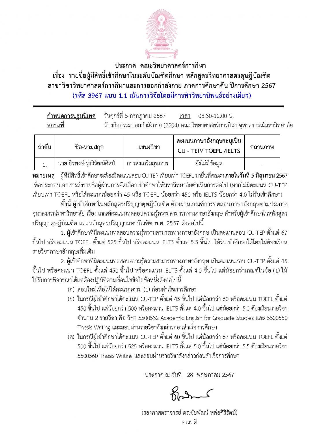 รายชื่อผู้มีสิทธิ์เข้าศึกษาในระดับบัณฑิตศึกษา หลักสูตรวิทยาศาสตรดุษฎีบัณฑิต สาขาวิชาวิทยาศาสตร์การกีฬาและการออกกำลังกาย ภาคการศึกษาต้น ปีการศึกษา 2567