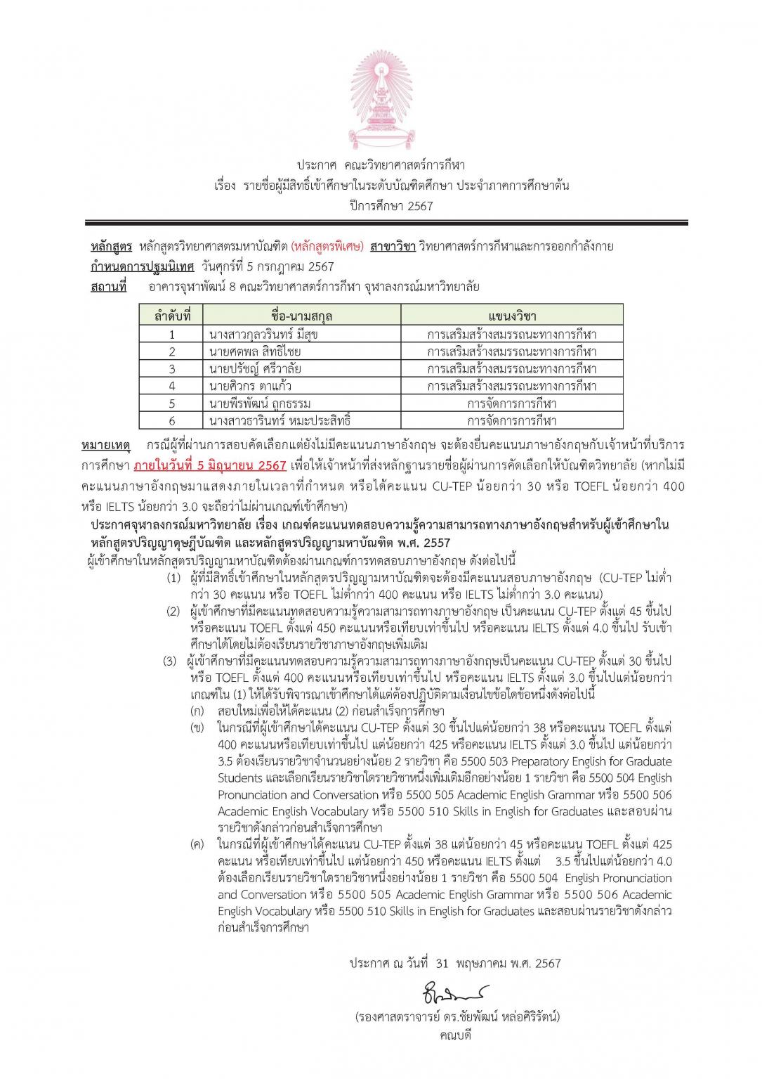 รายชื่อผู้มีสิทธิ์เข้าศึกษาในระดับบัณฑิตศึกษา ประจำภาคการศึกษาต้น ปีการศึกษา 2567 (หลักสูตรพิเศษ)