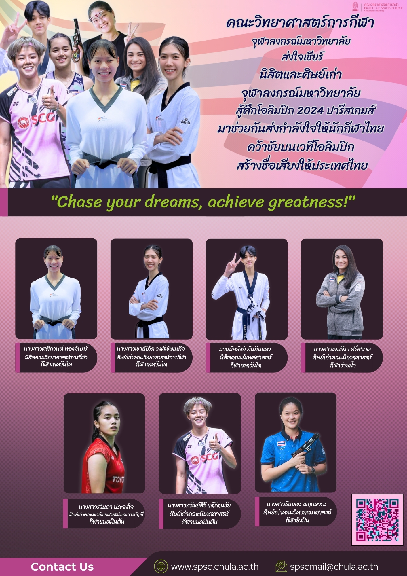 คณะวิทยาศาสตร์การกีฬา จุฬาลงกรณ์มหาวิทยาลัย ส่งใจเชียร์ นิสิตและศิษย์เก่า จุฬาลงกรณ์มหาวิทยาลัย สู้ศึกโอลิมปิก 2024 ปารีสเกมส์ มาช่วยกันส่งกำลังใจให้นักกีฬาไทย คว้าชัยบนเวทีโอลิมปิก สร้างชื่อเสียงให้ประเทศไทย