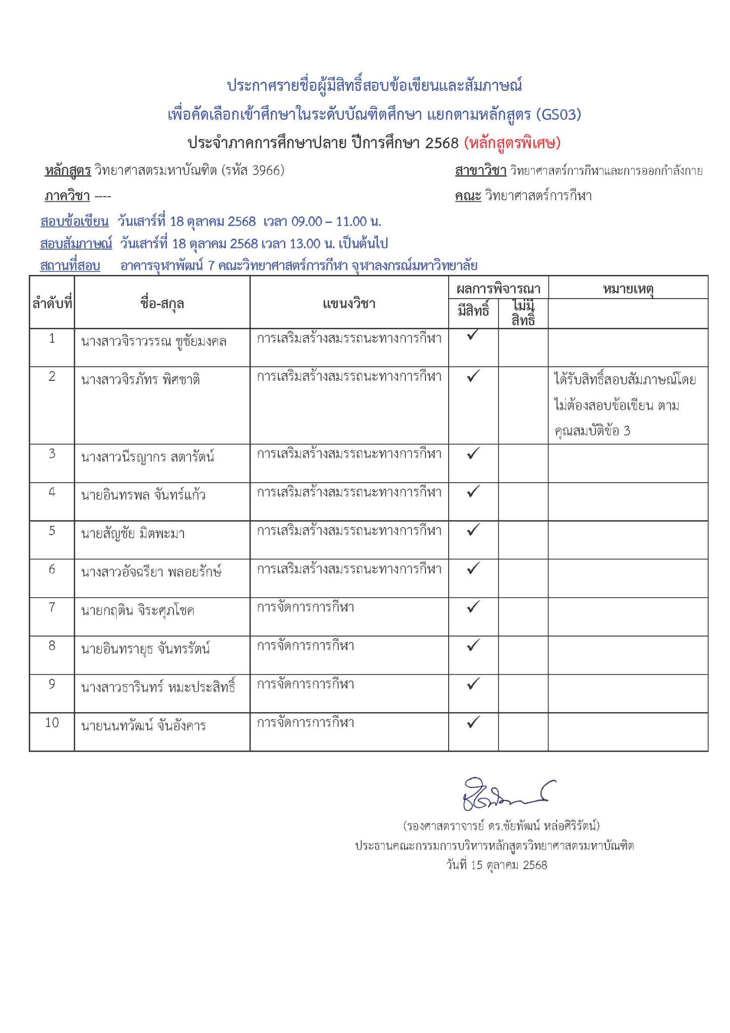 รายชื่อผู้มีสิทธิ์สอบข้อเขียนและสัมภาษณ์ เพื่อคัดเลือกเข้าศึกษาในระดับบัณฑิตศึกษา แยกตามหลักสูตร (GS03) ประจำภาคการศึกษาปลาย ปีการศึกษา 2568 (หลักสูตรพิเศษ) หลักสูตร วิทยาศาสตรมหาบัณฑิต (รหัส 3966) สาขาวิชา วิทยาศาสตร์การกีฬาและการออกกำลังกาย