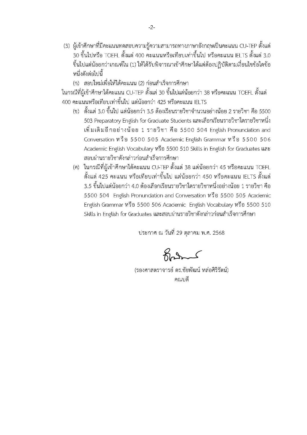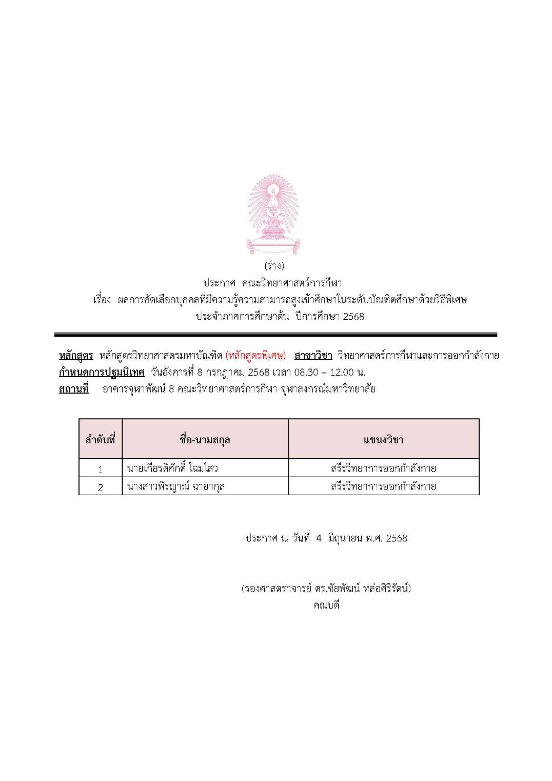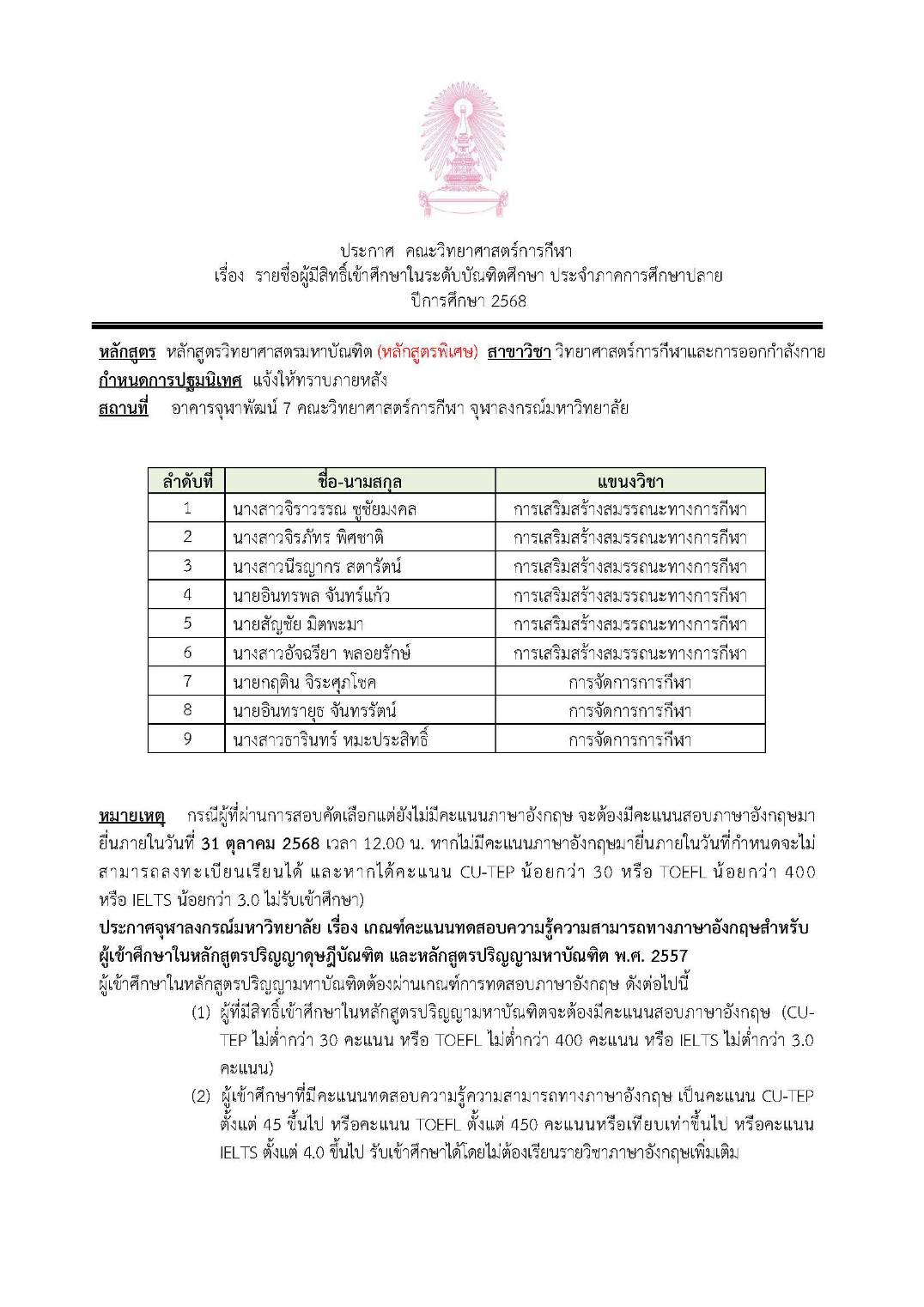 ประกาศ คณะวิทยาศาสตร์การกีฬา เรื่อง รายชื่อผู้มีสิทธิ์เข้าศึกษาในระดับบัณฑิตศึกษา ประจำภาคการศึกษาปลาย ปีการศึกษา 2568 หลักสูตรวิทยาศาสตรมหาบัณฑิต (หลักสูตรพิเศษ) สาขาวิชา วิทยาศาสตร์การกีฬาและการออกกำลังกาย