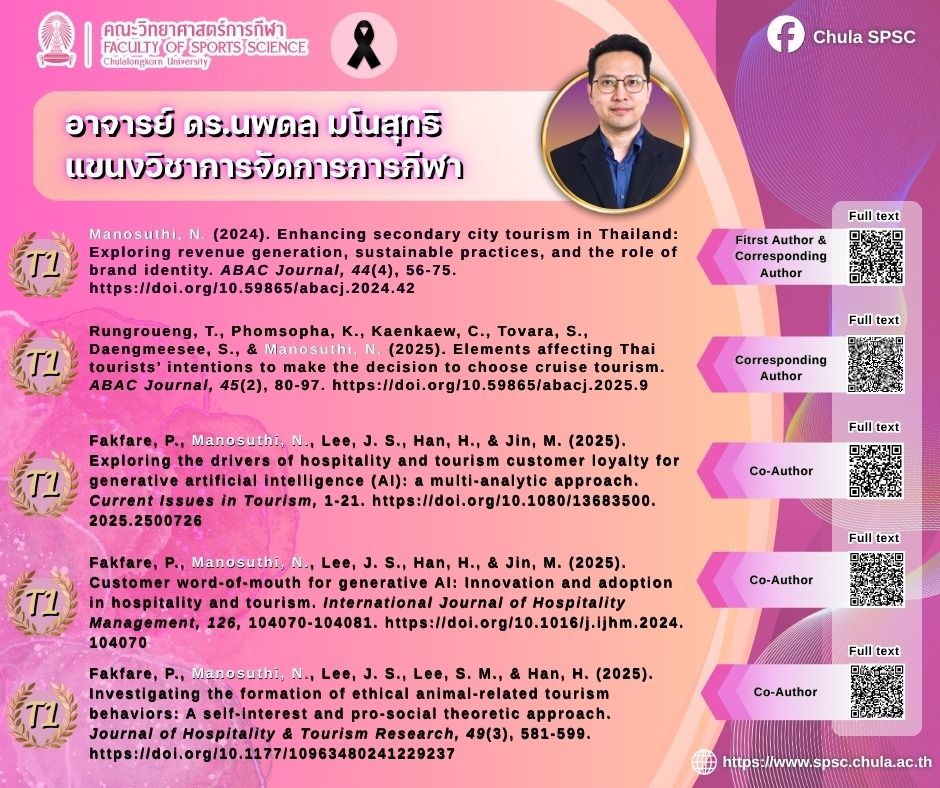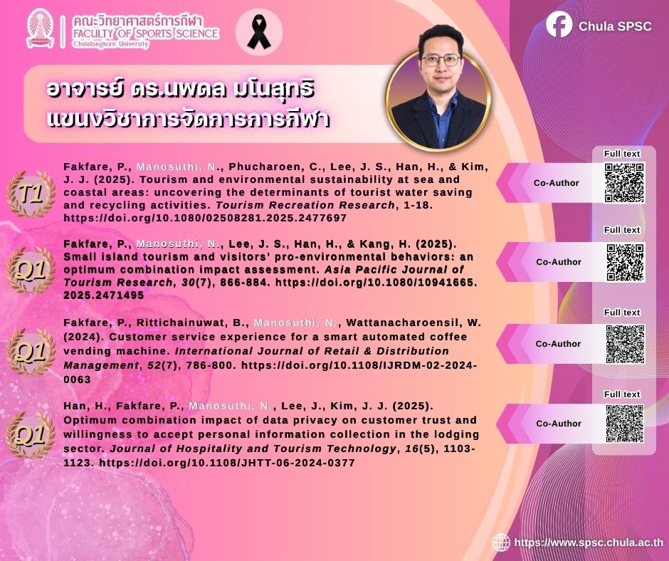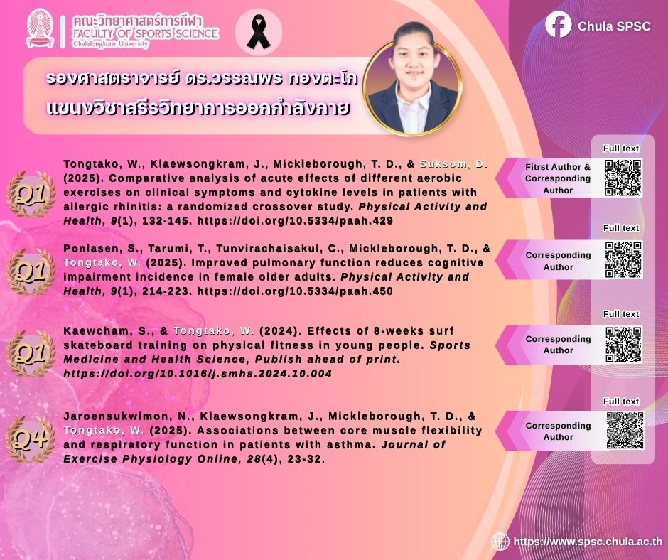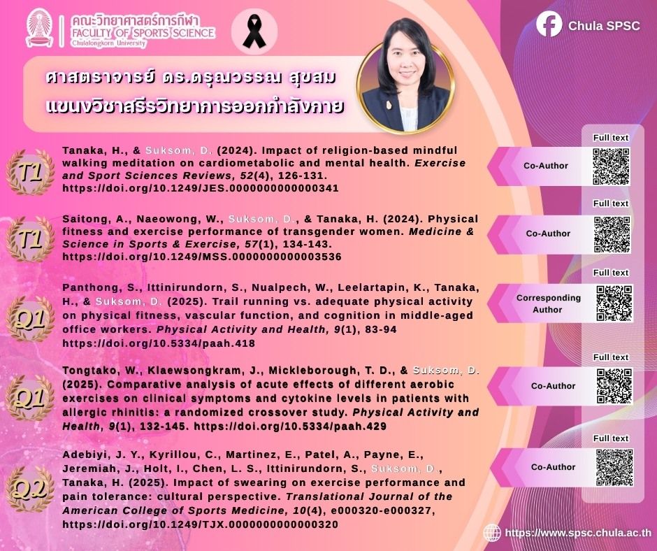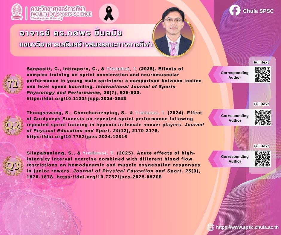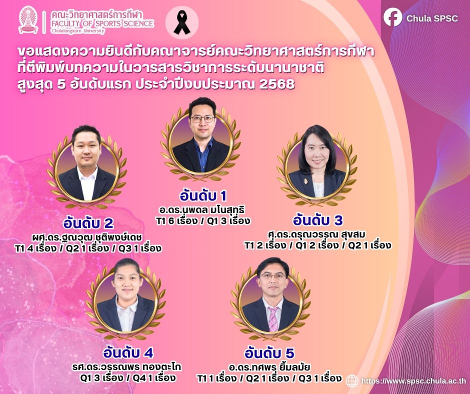 คณะวิทยาศาสตร์การกีฬา จุฬาลงกรณ์มหาวิทยาลัย ขอแสดงความยินดีกับคณาจารย์ที่ตีพิมพ์บทความในวารสารวิชาการระดับนานาชาติสูงที่สุด 5 อันดับแรก ประจำปีงบประมาณ 2568