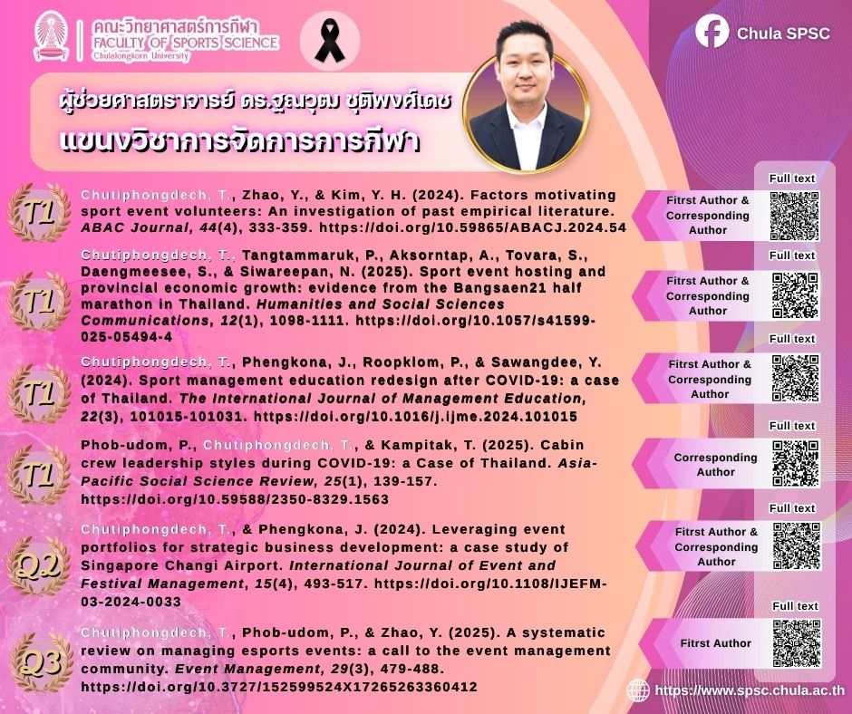 อันดับ 2 ผู้ช่วยศาสตราจารย์ ดร.ฐณวุฒ ชุติพงษ์เดช อาจารย์แขนงวิชาการจัดการการกีฬา (รวม 6 เรื่อง ได้แก่ T1 จำนวน 4 เรื่อง, Q2 จำนวน 1 เรื่อง และ Q3 จำนวน 1 เรื่อง)