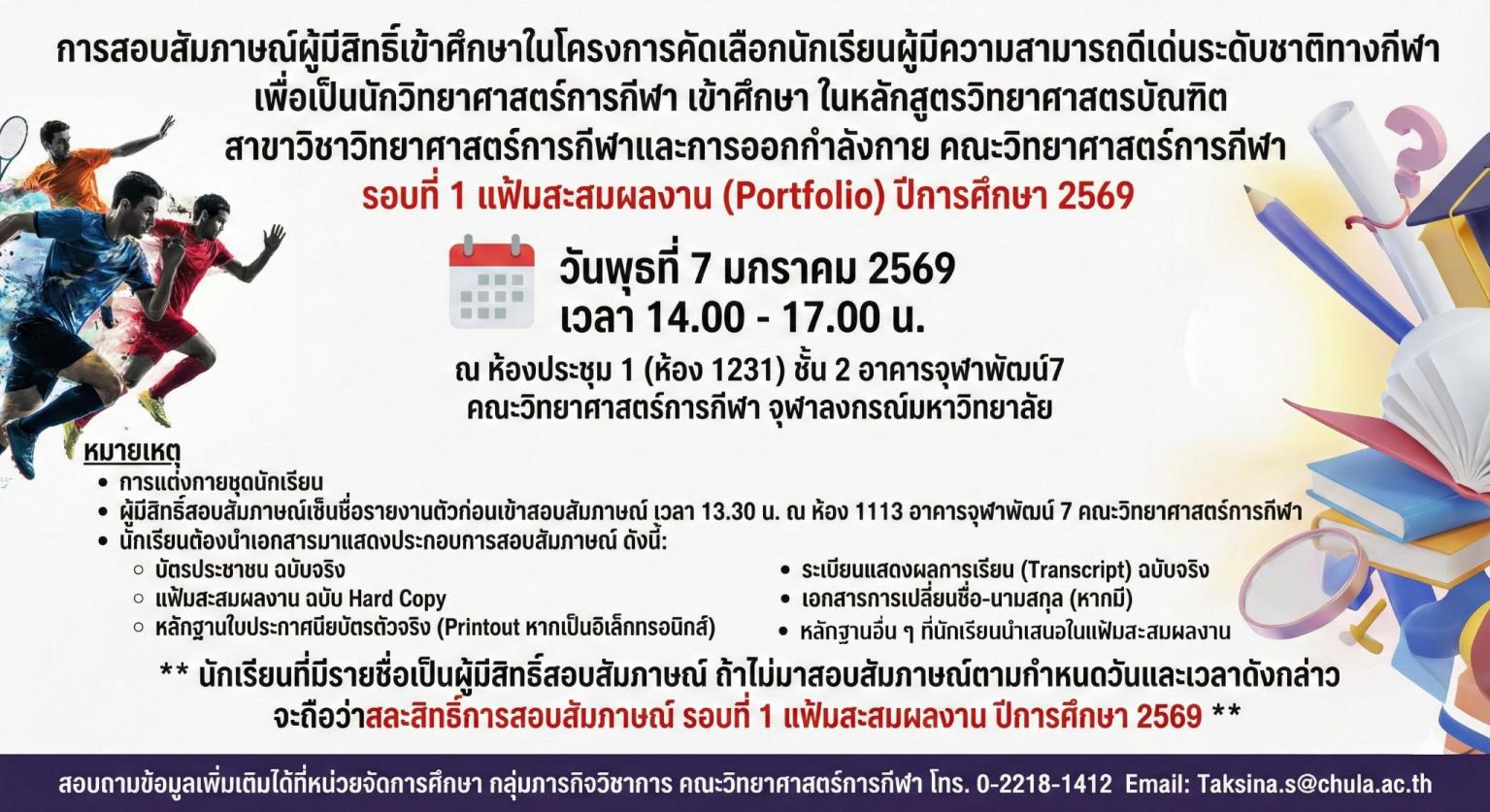 การสอบสัมภาษณ์ผู้มีสิทธิ์เข้าศึกษาในโครงการคัดเลือกนักเรียนผู้มีความสามารถดีเด่นระดับชาติทางกีฬา เพื่อเป็นนักวิทยาศาสตร์การกีฬา เข้าศึกษา ในหลักสูตรวิทยาศาสตรบัณฑิต สาขาวิชาวิทยาศาสตร์การกีฬาและการออกกำลังกาย คณะวิทยาศาสตร์การกีฬา รอบที่ 1 แฟ้มสะสมผลงาน (Portfolio) ปีการศึกษา 2569